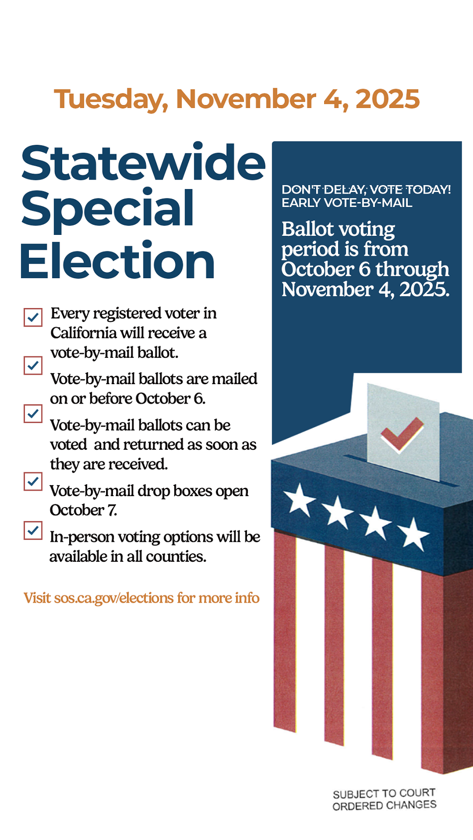 Election time is fast approaching, and your vote is vital in shaping our future! I am here to ensure you have everything you need to stay informed and prepared. Explore the resources available to help you and our community get ready for this important election year. The last day to register to vote for the November 4, 2025, Statewide Special Election is October 20, 2025.